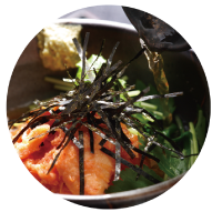 ご飯の上に鮭明太を乗せて、お好みでゴマやのり、わさびを添える
