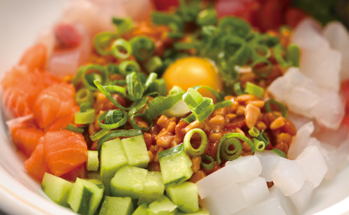 いろんな魚を納豆で和えたものに、うずらの卵、ネギ、もろみを混ぜて、海苔で巻いたユニークな逸品です。